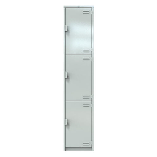 Locker metálico Basico de tres puertas, fabricado en lamina de acero rolado frío calibre 24, puertas con diseño de 4 ventanillas, jaladera de lamina media luna con porta candado acabado en pintura electrostática horneada, medidas 0.37×0.37×1.80