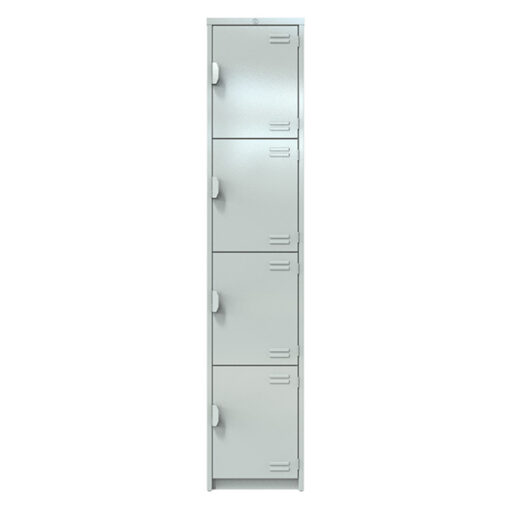 Locker metálico Basico de cuatro puertas, fabricado en lamina de acero rolado frío calibre 24, puertas con diseño de 4 ventanillas, jaladera de lamina media luna con porta candado acabado en pintura electrostática horneada, medidas 0.37×0.37×1.80