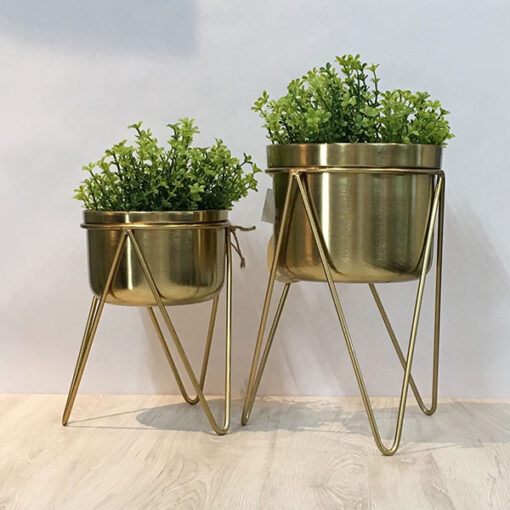 Juego de dos macetas de latón con base metálica tripie color dorado ideal para decorar cualquier espacio