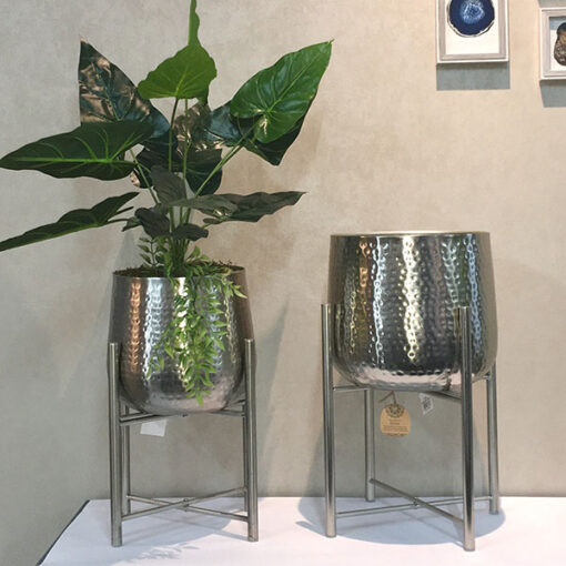 Juego de Macetas de piso metálicas acabado martillado cromo con base metálica, ideal para decorar cualquier espacio