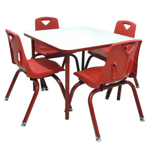 Mesa Escolar Cuadrada, cubierta fabricada en melamina de 19 mm de espesor con cantos de PVC y estructura
