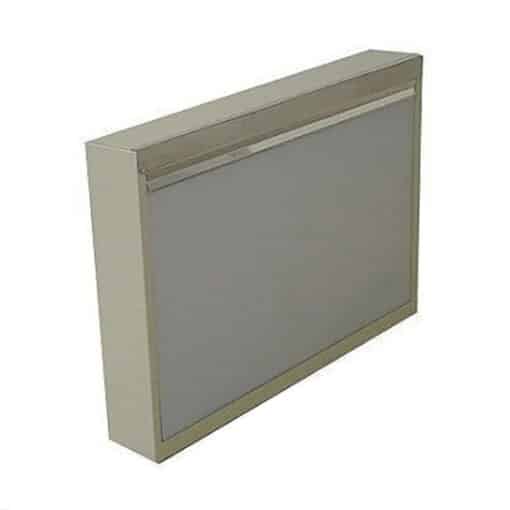 Negatoscopio doble fabricado en lamina calibre 22 acabado esmaltado, lámpara de 22w. acrílico blanco de “3”, cable pop 18 con tres metros de largo, apagador y protector de acero inoxidable. Dimensiones 110cm X 53.3cm X 10cm.
