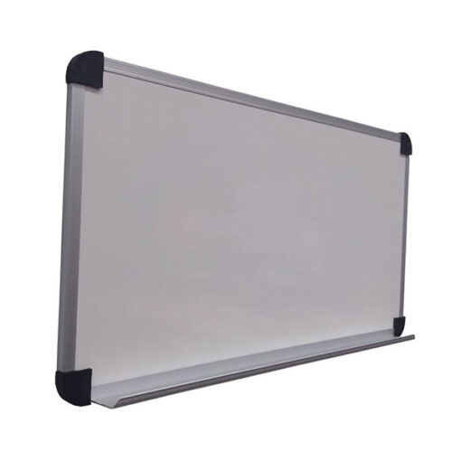 Pizarrón blanco en melamina cristalizada con cubierta: de 0.7 mm en melamina cristalizada de alta duración y desempeño en escritura con marcadores de tinta indeleble , base alcohol, acetona o chalk ink tras-cara en mdf de 6mm. Melamina cristalizada y mdf unidas entre si con pegamento esperable kr-115-v, marco perimetral de canal de aluminio anodizado natural en 9mm, corte 90 grados con estrías reforzantes y decorativas + regatones esquineros en polipropileno color negro, charola porta marcador y borrador en todo lo largo de parte inferior 9 barreno de ¼” para su instalación, con pija cabeza cónica de 8×10 y taquete largo de ¼” varias medidas disponibles