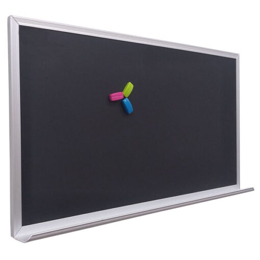 Pizarron Negro Porcelanizado Para Gis, Medidas:120×240 y 120×300 Superficie: en acero Porcelanizado Cal. 25, C/Acabado Negro Apto Para escritura con Gis Blanco o color, tiza o Liquido, Trascara En MDF de 6mm, -Marco Perimetral en Canal de 9 mm en Aluminio Anodizado Natural con Estrías