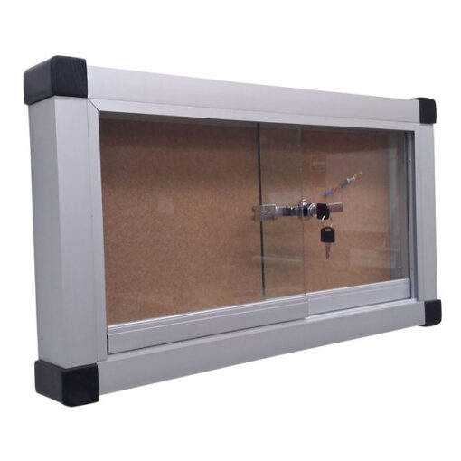 Base Pinchable en Corcho Natural, Tela-corcho Varios colores Tablero Ranurado Para Letras Plasticas o superficeies de escritura, Marco Perimetral En tubular rectangular de aluminio anodizado Natural de 3X1/2” Esquinas Redondeadas en MDF Color Negro Profundidad ideal para Utilizacion de chichetas, Puertas corredizas en Vidrio de 6mm C/Chapa Tipo caimán, varias medidas disponibles