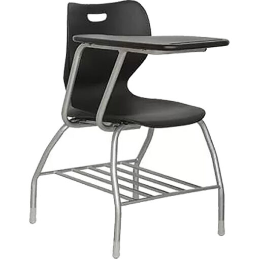 Pupitre Escolar estructura tubo de acero redondo de 7/8” calibre 18 en patas y paleta con solera de 3/4“x1/8”, soporte en tubo cuadrado de 3/4“ en calibre 18, pintura epoxica texturizada color negro y aluminio. Respaldo y asiento en una sola pieza en polipropileno rígido sin tapiz, diseño ergonómico, fijación, paleta en material hdpe virgen, en resina que cumple con propiedad antiflama grado ul94hb, 100% reciclable, fáciles de limpiar, tanto en la superficie como en la cara posterior, por carecer de retícula donde se acumula suciedad, color negro.