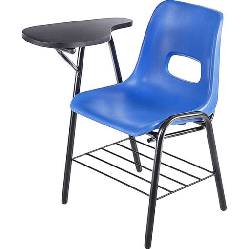 Pupitre Escolar con estructura tubular calibre 18 de 1″ color negro, asiento y respaldo en una sola pieza de polipropileno tipo concha, canastilla de acero pulido de1/4″, paleta de melamina 19mm color negro con cantos PVC termo adherido