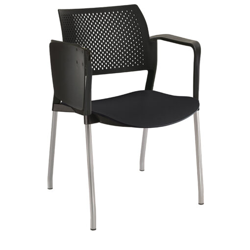 Pupitre escolar con estructura: de acero tubular de 7/8″ de diámetro, calibre 14; color gris, con descansabrazos de polipropileno en color negro y con paleta lateral abatible en color negro fijada al brazo mediante un dispositivo. Asiento y respaldo: en polipropileno de alta resistencia y duración. Color: varios colores disponibles. Peso máximo de resistencia: 300 kgs. Nota: disponible con paleta lateral lado izquierdo (sobre pedido). Disponible también en versión tapizada, semi tapizada y respaldo de malla.