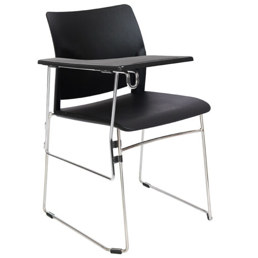 Pupitre escolar con estructura: barra de acero sólido de 11 mm de diámetro, con terminado en cromo. Con paleta lateral abatible color negro fijada a la estructura a base de presión por medio de un soporte. Asiento y respaldo: en dos piezas en polipropileno de alta resistencia y duración. Color: negro, gris, rojo, blanco o arena. Peso máximo de resistencia: 160 kgs.Disponible también en versión tapizada o con respaldo de malla.
