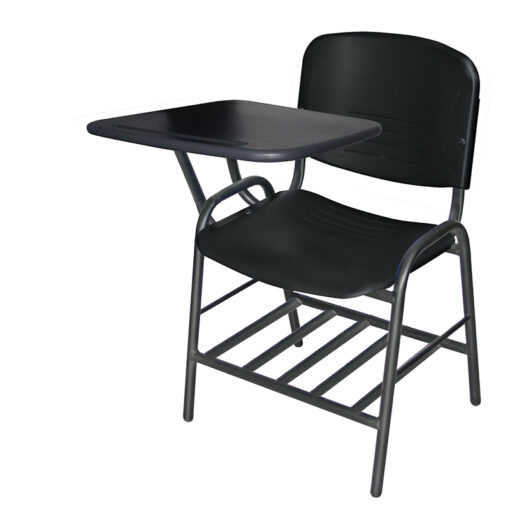 Pupitre escolar con estructura: de acero tubular 1″ de diámetro, calibre 18; con acabado de pintura epóxica (electrostática) color negro mate. Parrilla: de acero tubular 1″ de diámetro, calibre 18. Asiento y respaldo: en dos piezas en polipropileno de alta resistencia y duración. Color: negro. Paleta: color negro en copolimero de polipropileno de alta densidad, en 3/4″ de espesor con embutido para lápiz. Peso máximo de resistencia: 160 kgs. Aproximadamente. NOTA: disponible con paleta lateral lado izquierdo (fabricación sobre pedido).