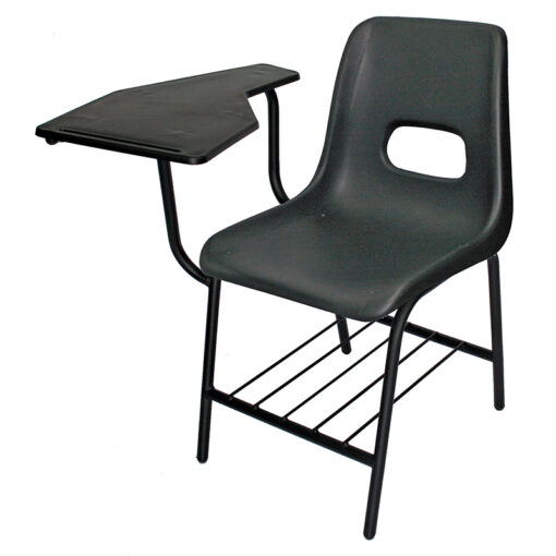 Pupitre escolar con estructura: de acero tubular de 7/8″ de diámetro, calibre 18, parrilla en perfíl pulido redondo de acero de 3/16″ de diámetro; con acabado de pintura epóxica (electrostática) color negro mate. Asiento y respaldo: de una sola pieza en polipropileno de alta resistencia y duración. Paleta: color negro, azúl, rojo, gris en copolimero de polipropileno de alta densidad, en 1/2″ de espesor con embutido para lápiz. Color: amarillo, rojo, verde, azul eléctrico, naranja, negro. Peso máximo de resistencia: 100 kgs. Nota: disponible con paleta lateral lado izquierdo (fabricación sobre pedido). La paleta en color rojo, azúl o gris es sobre pedido y un mínimo de 300pzs.