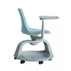 Pupitre giratorio, asiento y respaldo en una sola pieza de polipro-pileno y fibra de vidrio con diseño ergonómico, tableta de escritura giratoria 180° con ranura porta Ipad, base circular con espacio de guardado y rodamientos con cubierta de poliuretano.