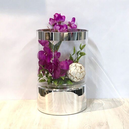 Quinqué grande de vidrio con base espejo reflejante arreglado con flores y esferas, ideal para complementar la decoración de tu espacio