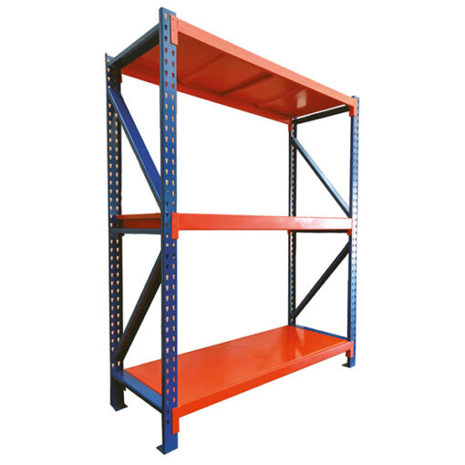 Rack anaquel metálico de 3 niveles de 225kg distribuidos por nivel, fácil ensamblaje, no requiere tornillería. Entrepaños reforzados, cuenta con placas para fijarse al piso. Medidas: 150cm x 60cm x 220cm. Color azul/naranja