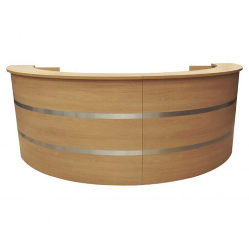 Modulo de recepción curvo con vistas frontales, fabricado en formica y melamina color a elección cantos PVC, cubierta transacción en melamina 28mm de espesor, cajonera de un cajón y una gaveta para archivo.