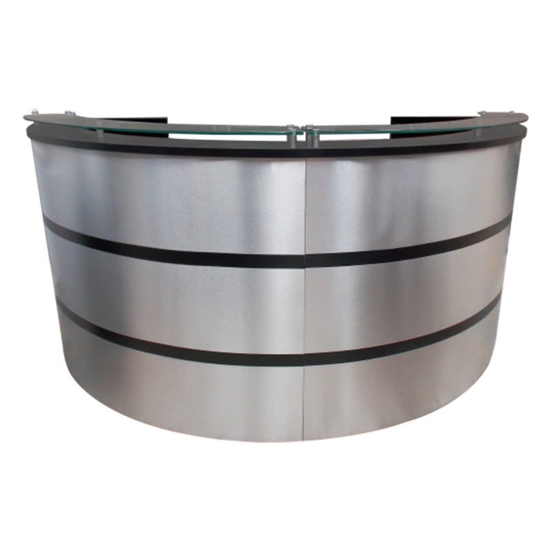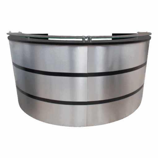 Modulo de recepción curvo con vistas frontales, fabricado en formica y melamina color a elección cantos PVC, cubierta transacción en cristal, cajonera de un cajón y una gaveta para archivo, medidas 2.40×0.60×1.10
