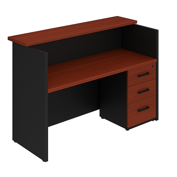 Módulo de recepción recto fabricado en melamina 28mm de espesor color a elección cantos PVC, medidas 1.80×0.60×1.10 cubierta transacción de 0.30 y cubierta de trabajo de 0.60 con cajonera de dos cajones y una gaveta para archivo tamaño oficio, mecanismo de cierre general con llave (varias medidas disponibles)