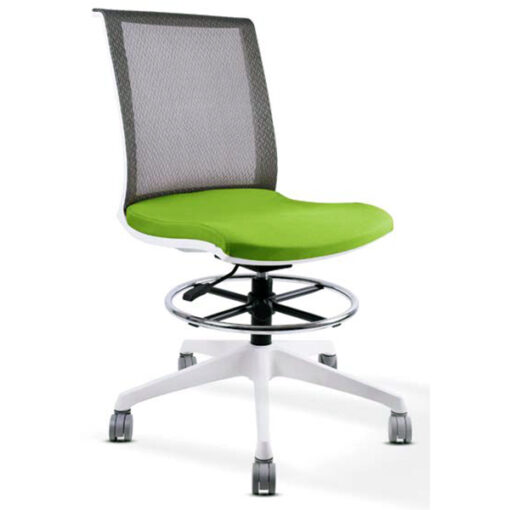 Silla alta tipo banco cajero con estructura de una sola pieza fabricada en color blanco, mecanismo giratorio, aro descansa pies con perilla para ajuste , pistón alto tipo taburete, base de 5 puntas en color blanco con rodajas de 60 mm en color gris , respaldo tapizado en malla y asiento tapizado en tela sin brazos