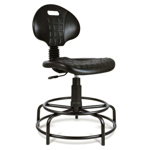 Silla industrial alta de poliuretano inyectado color negro con solera reforzada de cold rolled, palanca para ajuste de altura, pistón neumático, con base de araña de uso rudo con aro color negro