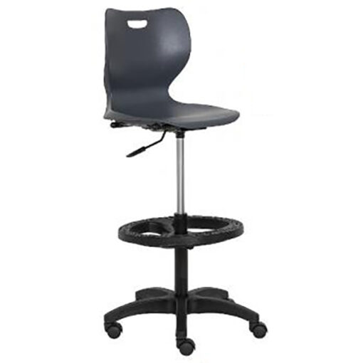 Silla Alta respaldo y asiento diseño en una sola pieza de polirpropileno (varios colores), rodajas tipo yoyo de nylon, sistema de elevación con pistón largo de gas modelo cajero base de nylon de 24″ de 5 puntas y descansa pies de nylon, mecanismo secretarial, con ajuste neumático de altura