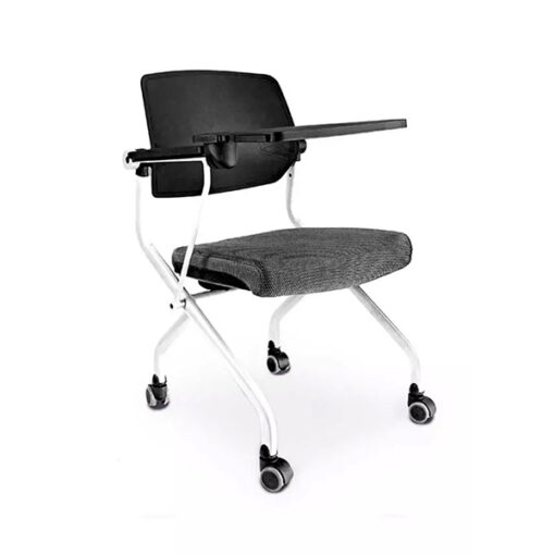 Silla training con paleta. Cuenta con estructura de acero tubular con acabado en pintura electrostática color gris. Su respaldo elaborado en polipropileno negro, cuenta con asiento acojinado en poliuretano inyectado y su paleta de escritura es abatible elaborada también en polipropileno de alto impacto, y su rodamiento está recubierto en poliuretano.