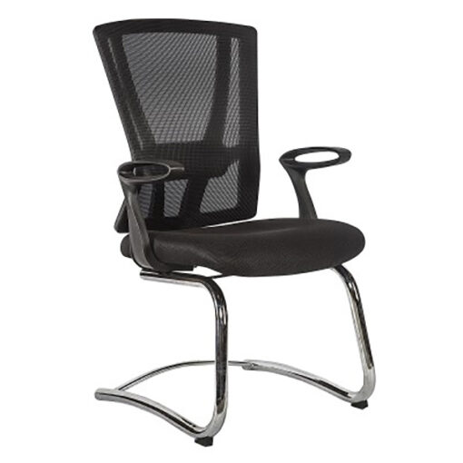 Silla visitante respaldo en malla color negro y asiento tapizado en variedad de colores (consultar catálogo de tapices), hule tipo poliuretano de inyección d. 45 kg/m³, base de trineo acabado en cromo y brazos en polipropileno. Todas las partes de plástico son en poliuretano.
