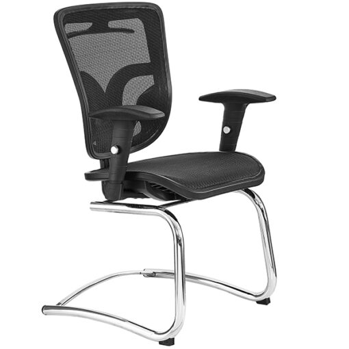 Silla visitante respaldo y asientos tapizados en malla tipo flex, base acabado cromado, brazo ajustable. Todas las partes de plástico son en polipropileno. Colores: azul, verde y negro.