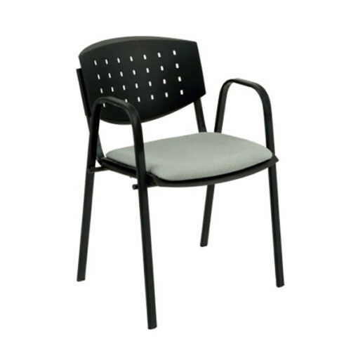 Silla visitante estibable, estructura en tubular ovalado de 1” cal. 18 en patas y cal. 16 en soporte de respaldo, terminado en pintura epóxica texturizada con soporte en asiento de tubo redondo de 5/8” cal. 18, tapones de polietileno en terminales para evitar rayaduras a pisos. Asiento y respaldo en plástico de polipropileno color negro en asiento y respaldo, con tapiz sobrepuesto en asiento variedad de colores (consultar catálogo tapices), brazos en tubular ovalado de 1″ calibre 18 integrados a la estrcutura