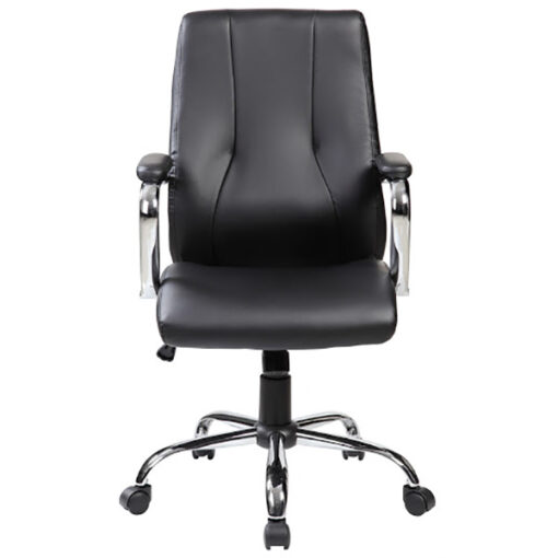 Sillón Ejecutivo unibloque de madera en 2 mm. de espesor, domada y contrachapada, asiento ergonómico en hule tipo aglutinado de 7 cms. de espesor y respaldo de 5 cms. de espesor; tapizado en vinil color negro o ivory. brazos fijos en cromo con acoginamiento en vinil color negro o Ivory, mecanismo reclinable con altura ajustable y perilla para ajustar la suavidad de reclinación, base estrella de 5 puntas en cromo, rodajas desmopán desmontables de 50mm de diámetro, peso aproximado de resistencia: 120 kgs.