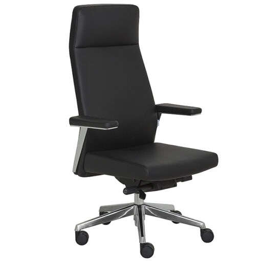 Sillon Ejecutivo respaldo y asiento con interior de madera en triplay preformado de 8 mm. de espesor, solera para fijacion, hule espuma en respaldo de 6 cms. y en asiento de 7 cms. de espesor con densidad 53 kgs./m³, tapizado en vinil color negro unicamente, base ejecutiva en aluminio de 26” con rodajas en nylon de 50 mm., piston ejecutivo en cromo con 50,000 ciclos continuos de vida, mecanismo de rodilla con sistema anti-shock, de altura y regulador de tension. soporta un peso de 150 kgs.