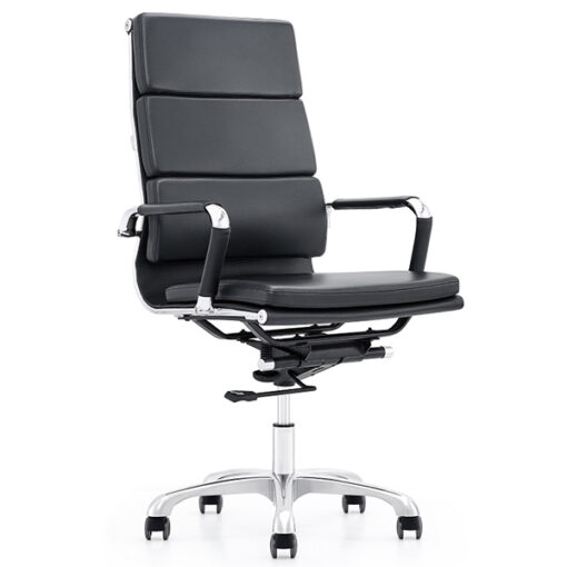 Sillón Ejecutivo respaldo y asiento tapizado en vinil color negro con grosor de 1 mm., hule espuma con densidad de 45 kgs./m³, estructura en marco y brazos de acero con grosor de 1.5 cms., brazos con fundas en vinil color negro, mecanismo de rodilla con sistema reclinable y de bloqueo, pistón ejecutivo, base de 26” en aluminio pulido, con rodajas tipo yoyo en nylon, soporta peso de 150 kgs.
