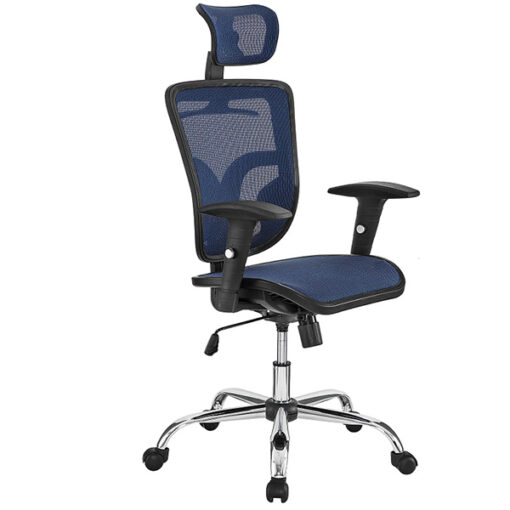 Sillón ejecutivo con cabecera ajustable y abatible, pistón y base de estrella en cromo, respaldo y asientos tapizados en malla tipo flex, mecanismo ejecutivo de respaldo reclinable y regulador de tensión, brazo ajustable. Todas las partes de plástico son en polipropileno. Colores: azul, verde y negro.