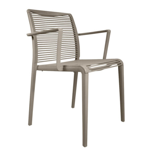 Silla con brazos elaborada en tecnopolímero con estructura sólida, asiento y respaldo flexible. Apilable. Para uso interno y externo.