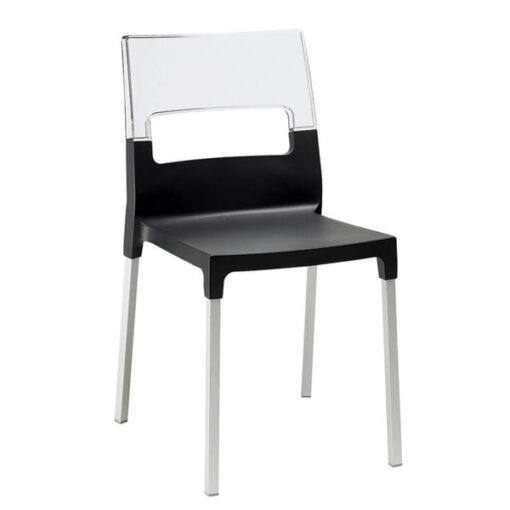 Silla con asiento en polipropileno reforzado con fibra de vidrio y respaldo en policarbonato transparente.