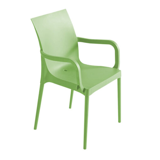 Silla en tecnopolímero disponible con brazos. Estructura de 4 patas metálica recubierta de tecnopolímero. Apilable. Para uso interno y externo.