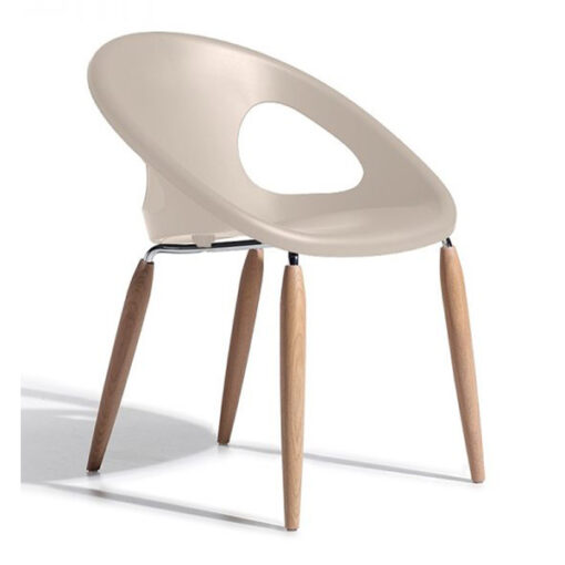 Silla con cuerpo en tecnopolímero reciclable, con estructura en madera sólida.