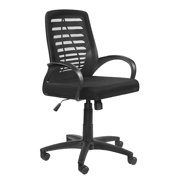 Silla operativa respaldo de estructura plástica tapizada en malla, variedad de colores (consultar catalogo tapices), asiento tapizado en variedad de colores (consultar catalogo tapices), rodajas tipo yoyo de nylon, sistema de elevación pistón de gas, base de nylon o cromada de 25″ de 5 puntas, mecanismo ejecutivo con ajuste neumático de altura, mecanismo de bloqueo y sistema reclinable, brazos fijos en polipropileno color negro.
