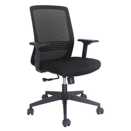 Silla Operativa base: estrella de 5 puntas en nylon reforzado, rodajas tipo dual y/o regatones. Elevación: por medio de pistón neumático que permite ajustar la altura del asiento. Mecanismo: plato de acero reforzado con sistema de reclinación y palanca de bloqueo, perilla de regulación de tensión para el sistema de reclinación. Brazos: ajustables de polipropileno semi-rígido on 7 posiciones. Respaldo: en malla de diseño ergonómico. Asiento: hule espuma de poliuretano inyectado flexible con densidad de 60 kgs/m3 con retardante a la flama y alta resistencia. Tapiz: respaldo de malla de color negro y asiento en tela al color de su elección de nuestro catálogo. Peso máximo de resistencia: 100 kgs.
