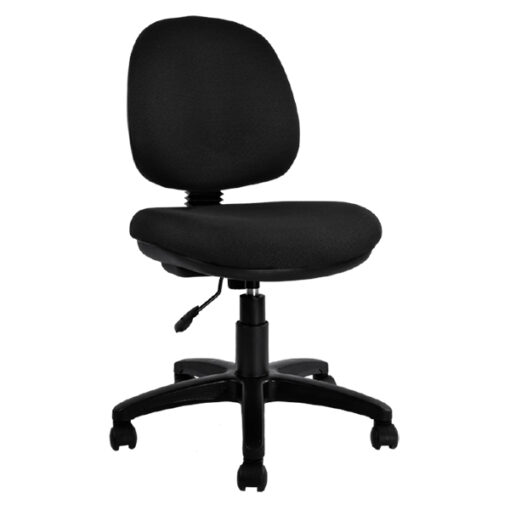 Silla secretarial básica, asiento amplio, mecanismo giratorio con palanca para ajustar la altura, pistón neumático, base reforzada de 5 puntas con rodajas gemelas, tapizada solo en crepe color negro