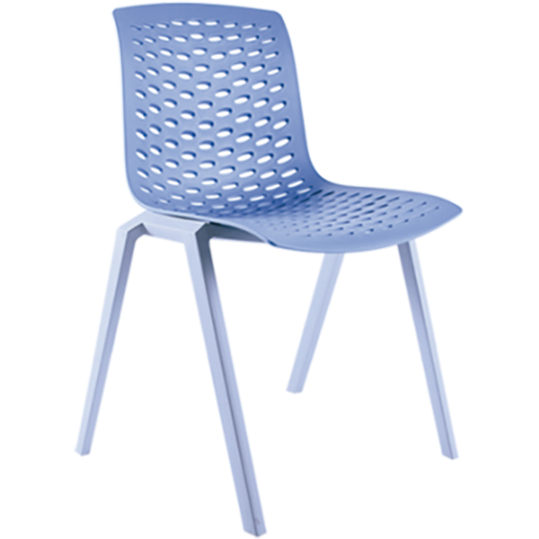 Silla polivalente de 4 patas, fabricada con estructura de 4 patas en nylon color gris y tapones antiderrapantes , top superior en polipropileno en colores rojo, plumbago y blanco con protección UV para Exteriores , diseño de perforaciones ovaladas