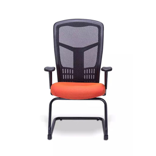 Sillón ejecutivo de visita respaldo alto en mesh. Descansa brazos con ajuste de altura, asiento ergonómico tapizado y su base en forma de trineo, elaborada en acero tubular redondo cal.14, terminado en pintura electrostática color negro.