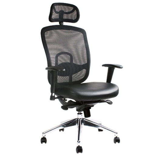 Sillón operativo de lujo con respaldo alto, tapizado en tecnoleather en el asiento y malla en el respaldo, cabecera con ajuste de altura, mecanismo de rodilla syncronizado con multibloqueo, base aluminio y brazos con ajuste de altura