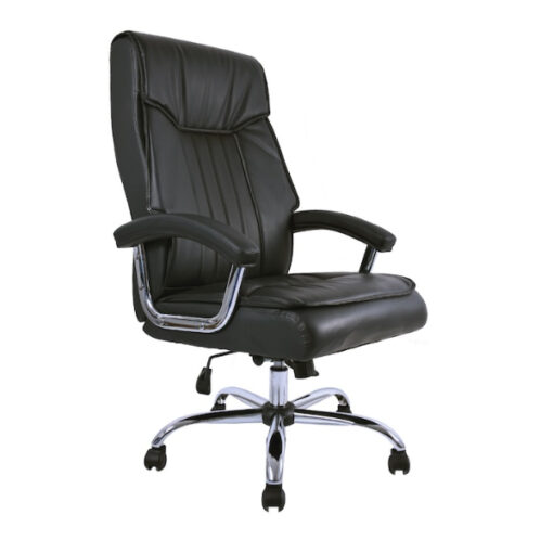 Sillón ejecutivo de respaldo alto, fabricado en bastidor de madera con banda elástica en asiento , espuma de poliuretano flexible, brazos en acero terminado en cromo, con pad tapizado, mecanismo ejecutivo reclinable con palanca de bloqueo en cualquier posición, base cromada tapizado en lether touch negro