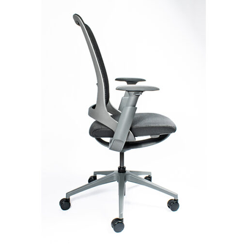 Sillón Ejecutivo con mecanismo de reclinamiento sincrónico con 2 posición de bloqueo sistema auto pesante. Sistema de reclinamiento y elevación por medio de botones laterales. Mecanismo fabricado en aluminio terminado en pintura electrostática. Marco de respaldo fabricado en polipropileno color gris, tapizado en mesh 100% polyester negro. Soporte lumbar ajustable y flexible multiperforada de polipropileno, asiento con diseño ergonómico de poliuretano inyectado de 53kg/m3, parte interna de polipropileno con cubierta decorativa en la parte inferior del asiento. Brazos ajustables 4d de polipropileno con pad de poliuretano suave. Cabecera ajustable tapizada en tactopiel color gris. Base de 5 puntas en aluminio terminada en pintura electrostática” 28 de diámetro. Rodamientos duales de 60mm de diámetro fabricados en nylon con cubierta de poliuretano. Uso Ejecutivo / operativo / salas de junta.