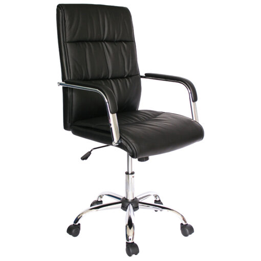 Sillón Ejecutivo Línea económica base: estrella de 5 puntas en metal, terminada en cromo y con rodajas tipo dual. Elevación: por medio de pistón neumático que permite ajustar la altura del asiento con terminado en cromo. Mecanismo: plato de acero reforzado con sistema de reclinación y palanca de bloqueo, perilla de regulación de tensión para el sistema de reclinación. Asiento y respaldo: respaldo medio, hule espuma laminado flexible con densidad de 22 kgs/m³ en el respaldo y 24 kgs/m³ en el asiento, de alta resilencia; con brazos de acero tubular cromado tapizados. Tapiz: soft revolving leather color negro. Peso máximo de resistencia: 80 kgs. Exclusivamente para uso residencial.