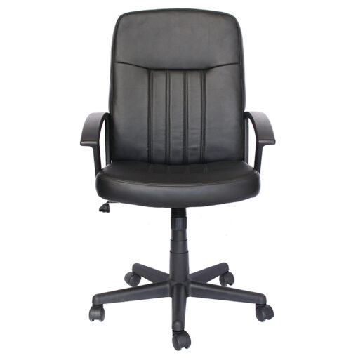 Sillón Ejecutivo Línea económica base: Estrella de 5 puntas en nylon reforzado con rodajas tipo dual. Elevación: por medio de pistón neumático que permite ajustar la altura del asiento. Mecanismo: plato de acero reforzado con sistema de reclinación y palanca de bloqueo, perilla de regulación de tensión para el sistema de reclinación. Asiento y respaldo: de respaldo medio, hule espuma laminado flexible con densidad de 22 kgs/m³ en el respaldo y 24 kgs/m³ en el asiento, alta resilencia; con brazos de polipropileno rígido. Tapiz: soft revolving leather negro. Peso máximo de resistencia: 80 kgs. Exclusivamente para uso residencial.