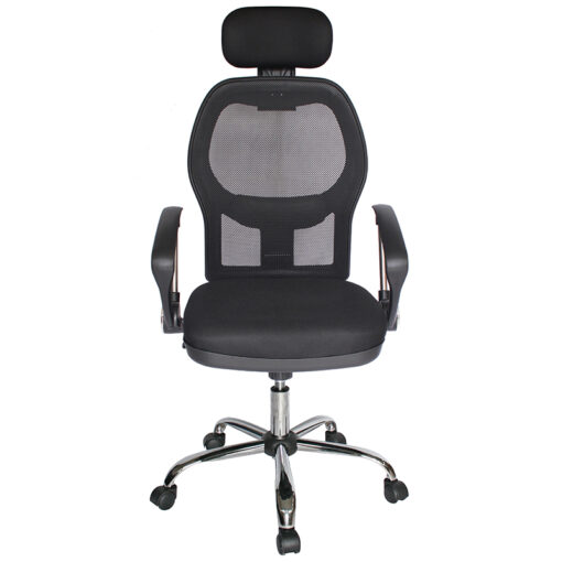 Silla Operativa Línea Económica Base: estrella de 5 puntas en metal, terminada en cromo y con rodajas tipo dual. Elevación: por medio de pistón neumático que permite ajustar la altura del asiento con terminado en cromo. Mecanismo: plato de acero reforzado con sistema de reclinación y palanca de bloqueo, perilla de regulación de tensión para el sistema de reclinación. Respaldo: alto en malla de diseño ergonómico con cabecera acojinada y tapizada. Asiento: hule espuma laminada flexible con densidad de 24 kgs/m³ y alta resilencia; brazos de polipropileno semi-rígido con soporte de acero. Tapiz: malla en color negro y asiento en tela microespacial de color negro. Peso máximo de resistencia: 80 kgs. Exclusivamente para uso residencial.