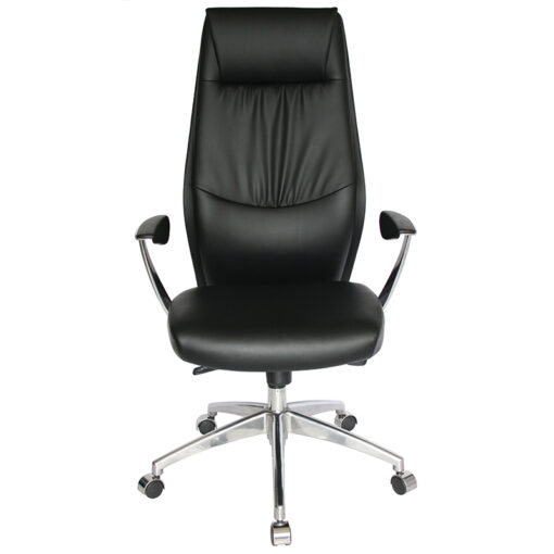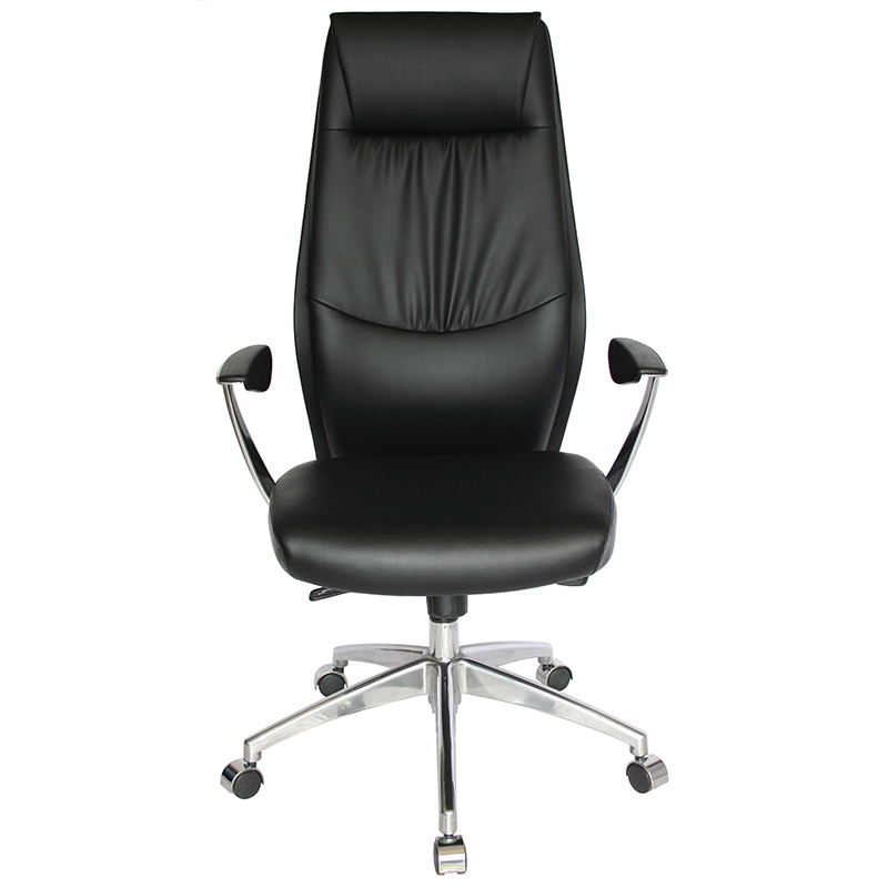 Sillón Ejecutivo base: estrella de 5 puntas en fundición de aluminio, terminado en aluminio pulido y con rodajas tipo dual y/o regatones. Elevación: por medio de pistón neumático que permite ajustar la altura del asiento. Mecanismo: en acero reforzado tipo articulado synchro con anti-shock con palanca de bloqueo, perilla de regulación de tensión para el sistema de reclinación. Brazos: de aluminio fundido y pulidos con terminado natural. Acojinados y tapizados en soft revolving leather color negro. Asiento y respaldo: de respaldo alto, hule espuma laminado flexible con densidad de 50 kgs/m3 y alta resilencia. Tapiz: en soft revolving leather de color negro. Peso máximo de resistencia: 160 kgs.