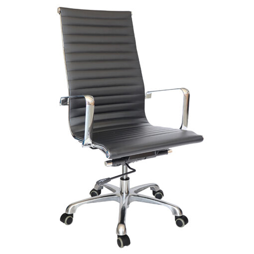 Sillón Ejecutivo Base: estrella de 5 puntas en aluminio fundido y pulido, rodajas tipo dual y/o regatones. Elevación: por medio de pistón neumático que permite ajustar la altura del asiento Mecanismo: en solera de acero tipo articulado de rodilla «knee tilt» con sistema de reclinación y palanca de bloqueo, perilla de regulación de tensión para el sistema de reclinación y palanca de bloqueo para la inclinación del respaldo. Brazos: de aluminio fundido y pulidos con terminado en cromo. Asiento y respaldo: alto de un sólo corte tensado con la estructura para dar una suspensión única y adaptarse al cuerpo tapizado en soft revolving leather acojinado con hule espuma laminada flexible con densidad de 17 kgs/m3; toda la estructura es de acero tubular con terminado en cromo. Color: negro. Peso máximo de resistencia: 160 kgs. Disponible también en versión respaldo medio y visitante base trineo