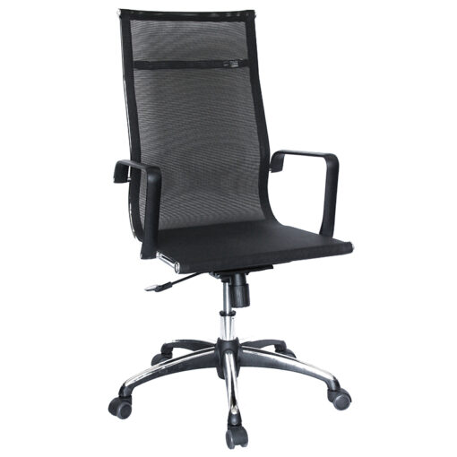 Sillón Ejecutivo Base: estrella de 5 puntas en nylon reforzado con cubierta de lámina de acero terminada en cromo y con rodajas tipo dual y/o regatones. Elevación: por medio de pistón neumático que permite ajustar la altura del asiento. Mecanismo: plato de acero reforzado con sistema de reclinación y palanca de bloqueo, perilla de regulación de tensión para el sistema de reclinación. Brazos: de polipropileno semi-rígido color negro. Asiento y respaldo: de respaldo alto con bastidor redondo tubular de 1″ de diámetro, calibre 16. Tapiz: en malla de color negro. Peso máximo de resistencia: 160 kgs.